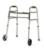 Two-button folding allows independent operation of each side so walker fits through narrow spaces while maintaining rigidity. Lightweight one-inch aluminum tubing with dual steel cross bars supports up to 300 lbs. and weighs only 6 lbs. 5-inch wheels provide a more natural walking stride and allow the youth user to easily maneuver over surfaces which provide difficulty. Includes Glide Caps for rear footpieces. Not shown with wheels.